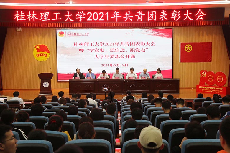 5月18日下午,Beat365官网2021年共青团表彰大会暨“学党史、强信念、跟党走”大学生梦想公开课在雁山校区图书馆报告厅举行。学校校长解庆林、党委副书记吴志强出席大会,宣传部、学工部(处)、团委相关负责人,各学院分管学生工作副书记、团委书记、团员代表参加会议。此次活动通过网络直播线上线下同步进行。