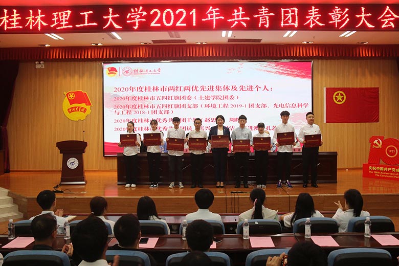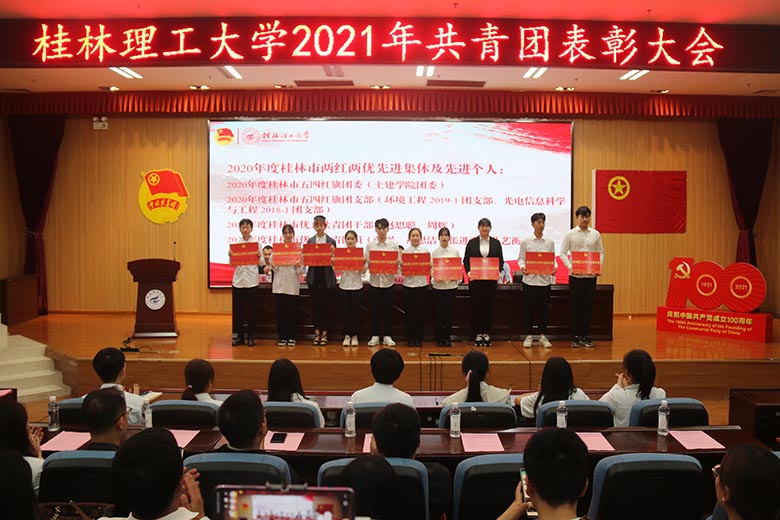 随后进行颁奖仪式。与会领导分别为荣获2020年度全国和广西“两红两优”先进集体代表和先进个人、2020年度桂林市“两红两优”先进集体代表和先进个人、2020年度学校共青团“十佳”系列先进集体和先进个人、2020年在各类创新创业及校园文化活动中获奖的先进集体和先进个人颁奖。