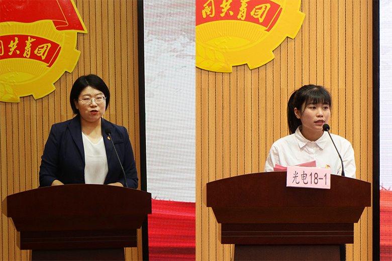 2020年度广西“优秀共青团干部”获得者赵思聪和2020年度桂林市“五四红旗团支部”理学院光电信息科学与工程2018-1团支部代表李丽,分别代表获奖个人和集体进行发言。