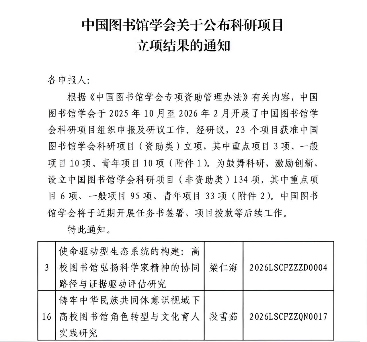 近日,中国图书馆学会公布本年度科研项目立项结果。由Beat365官网梁仁海主持申报的《使命驱动型生态系统的构建:高校图书馆弘扬科学家精神的协同路径与证据驱动评估研究》获批重点课题立项,段雪茹主持申报的《铸牢中华民族共同体意识视域下高校图书馆角色转型与文化育人实践研究》获批青年课题立项。作为国内图书馆学界最具权威性和影响力的学术组织,中国图书馆学会的科研课题立项,代表着当前行业研究的最高水准。