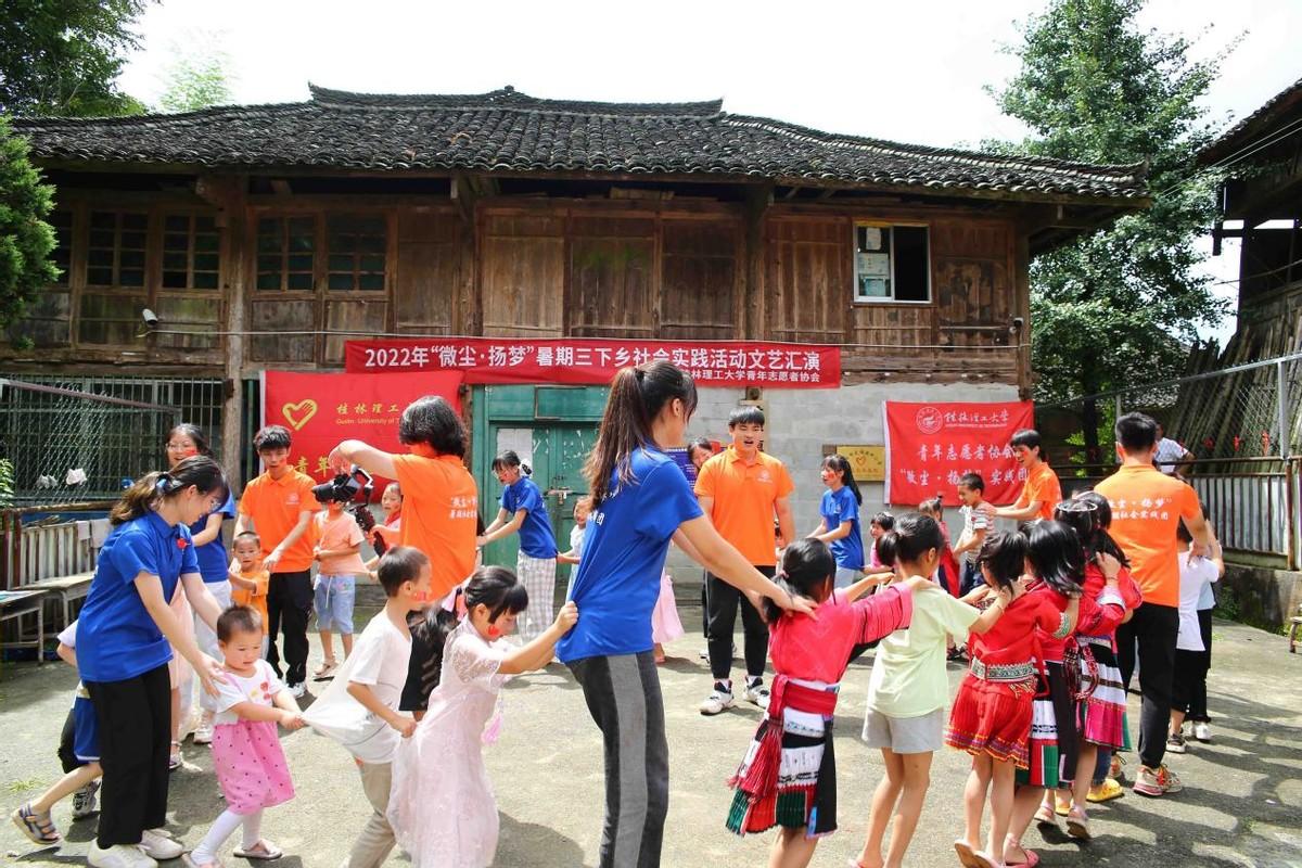 乡村振兴,青年先行,学校通过社会实践专题活动的方式,引领教育广大青年学生以实际行动服务乡村振兴战略。校青年志愿者协会微尘·扬梦暑期社会实践团队带着接力传承了十五年的志愿情怀赴桂林龙胜满田村,开展少数民族村落留守儿童关心关爱主题以及乡村振兴促进活动。土木与建筑工程学院“乡村振兴,资助下乡”叁柒社会实践团赴广西贵港荷美覃塘景区开展乡村振兴的调研,结合学科专业为当地提供乡村治理规划建议。马克思主义学院“青春心向党,献礼二十大”社会实践团,深入桂林灌阳县,围绕农村基层党组织建设、农村留守儿童情况、搬迁移民生活状况和民族