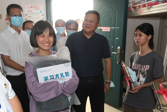 学校领导为黄丽君(前排中)和同宿舍新生送上入学大礼包。李凯摄