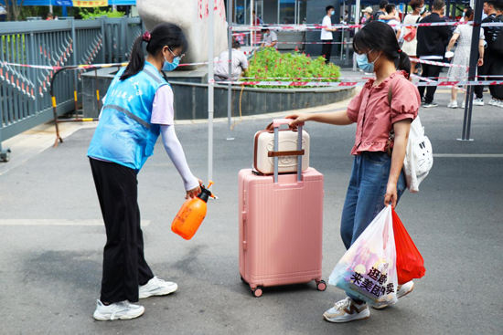 志愿者为入校新生进行行李消杀。黄彬桂摄