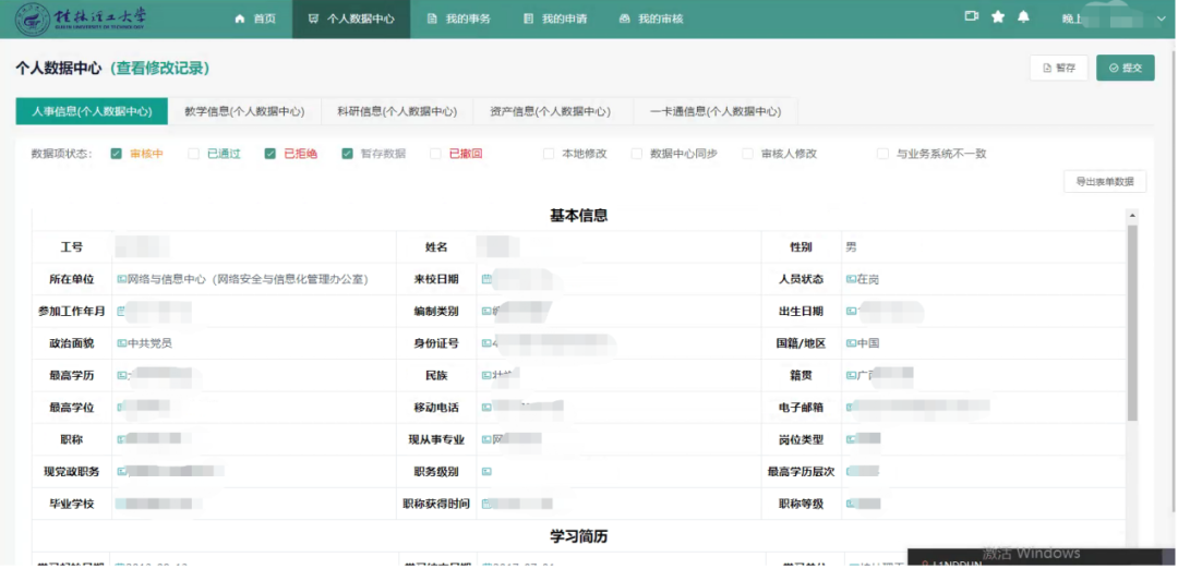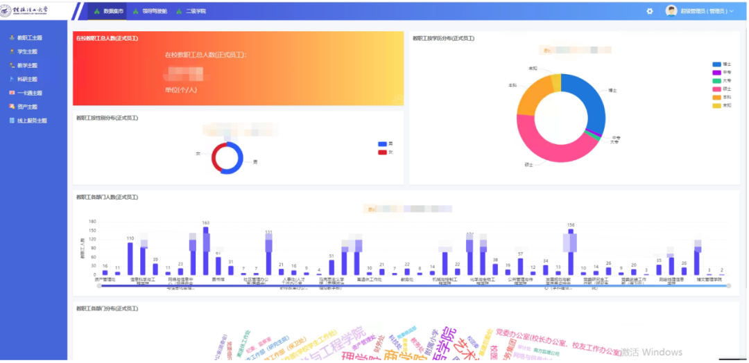 汇聚师生个人数据资产,按主题域并分层级展示个人在校工作、科研、学习、生活等相关过程与成果数据,提供统一、便捷的数据查询界面,解决数据跨系统查询问题;用展示图从教学工作量、教学评价、科研业绩、获奖、年度考核等维度立体和直观地呈现教师的各类统计数据;数据门户支持个人数据纠错和补录,实现个人数据一处纠错,全校通用;相关部门负责人可掌握相应数据资产的汇总情况,从而更好地辅助科学决策。