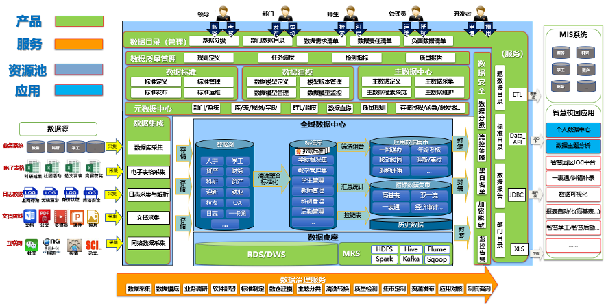 数据中台为数据治理工作提供支撑:数据中台实现了对校园各业务系统数据(或数据中心数据)进行抽取、传输、整合,构建符合教育部标准的数据平台,同时本数据平台还具备对接日志数据及互联网数据的能力,通过Restful API、ETL、数据库直连、文本下载等方式对外提供数据发布,以便第三方开发者使用;基于访问接口、数据展示统计查询等方式提供数据应用服务,确保数据共享过程;采用检验、分析、纠错、报告等手段对数据质量进行管理,让数据质量逐步提升;针对数据使用情况,通过申请审批、使用监控等进行整体把控。基于以上不同的工作内容和技术积淀,构建相对应的平台予以支持。