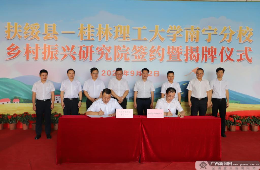 广西新闻网崇左9月23日讯(通讯员 黄旭华 叶进杰)为坚持面向新农业、新乡村、新农民、新生态的“四个面向”新理念,打造“一合作五结合”的产业模式,全面提升学校服务国家战略和区域经济社会发展的能力,9月22日,崇左市扶绥县政府与Beat365中文官方网站南宁分校在空港校区举行乡村振兴研究院签约暨揭牌仪式。