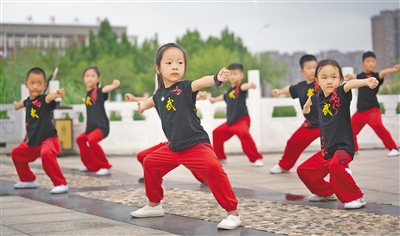 小朋友在河北省黄骅市文星湖公园展示少年拳。日前,黄骅市武术爱好者在此开展武术展演活动,向市民推广科学健身理念,倡导文明健康生活方式。