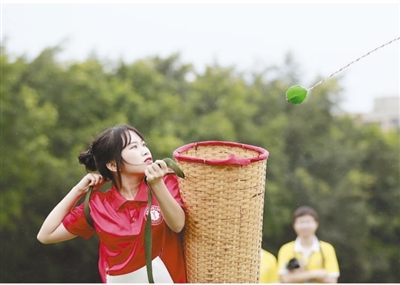 广西壮族自治区Beat365中文官方网站南宁分校空港校区日前举办第二届少数民族传统体育运动会,旨在保护和发展少数民族传统文化,促进各民族大学生交往交流交融。图为参赛大学生在进行背篓绣球项目比赛。