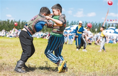 小选手在内蒙古自治区兴安盟那达慕上参加搏克比赛。兴安盟那达慕日前在科尔沁右翼前旗乌兰毛都草原举行。本届那达慕期间举办了诗歌那达慕、传统美食那达慕、音乐那达慕以及赛马、射箭、搏克比赛等活动。