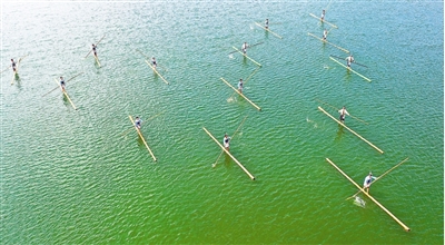 贵州省第十届少数民族传统体育运动会独竹漂表演项目日前在黔东南苗族侗族自治州榕江县举行。图为榕江县独竹漂队正在进行独竹漂团体项目表演。独竹漂是贵州一项民间技艺,过去因交通条件落后,人们脚踩一根楠竹,漂行水上。2009年,独竹漂入选贵州省第三批非物质文化遗产名录。