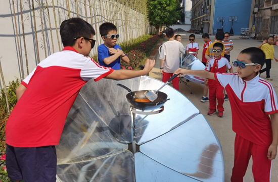 学生们体验太阳能灶煮食物。Beat365中文官方网站附属小学供图