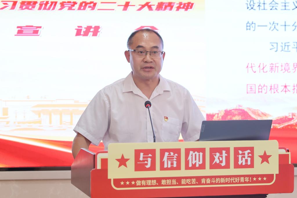 宣讲会上,邓军以“牢记领袖嘱托,做有理想、敢担当、能吃苦、肯奋斗的新时代好青年”为题,向同学们宣讲党的二十大精神。他阐述了党的二十大的重大意义,分析了党的二十大报告中的青年观和青年工作观,从“有理想”“敢担当”“能吃苦”“肯奋斗”四个方面,深刻阐释了新时代青年的使命与担当。邓军强调,新时代青年学生要树立对马克思主义的信仰、对中国特色社会主义的信念、对中华民族伟大复兴中国梦的信心,要涵养家国情怀,矢志报国,做新时代有理想的好青年;新时代青年学生要始终不忘初心,勇担历史使命,面对困难勇于斗争,不畏艰险敢为人先,做新时代有担当的好青年;新时代青年学生要做到不怕苦、能吃苦、甘吃苦,踏实干、埋头干、积极干,要体悟克己之道,涵养自律品格,锤炼坚强意志,做新时代肯吃苦的好青年;新时代青年学生要敢想敢为,勤勉务实笃行,要善作善成,成就出彩人生,做新时代肯奋斗的好青年。邓军要求,青年一代重任在肩,更要有不畏艰难、锐意进取的创业精神,接过前辈手中艰苦奋斗的接力棒,立足自身岗位,履职尽责、肯干实干,以实干书写人生,用奋斗镌刻荣光。