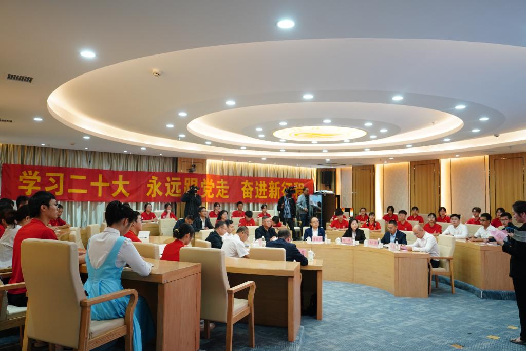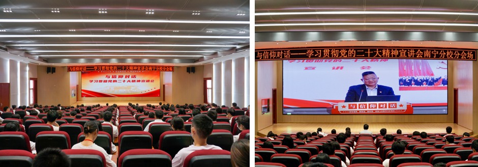 为深入学习宣传贯彻党的二十大精神,更好团结引领广大团员青年紧跟党奋进新征程,夺取新胜利,11月15日下午,Beat365中文官方网站在雁山校区大学生创新创业园案例研讨室举行“与信仰对话——学习贯彻党的二十大精神宣讲会”。学校党委书记邓军,党(校)办、组织部、宣传部、统战部、学工部(处)、马克思主义学院、校团委主要负责人,二级学院党委副书记、团委书记代表,和学校第十二期青年马克思主义者培养工程大学生骨干培训班学员齐聚一堂,共同学习领会党的二十大精神。本次活动采用“现场宣讲+线上直播”的形式同步进行,在雁山校区、屏风校区、南宁分校分别设立视频分会场。