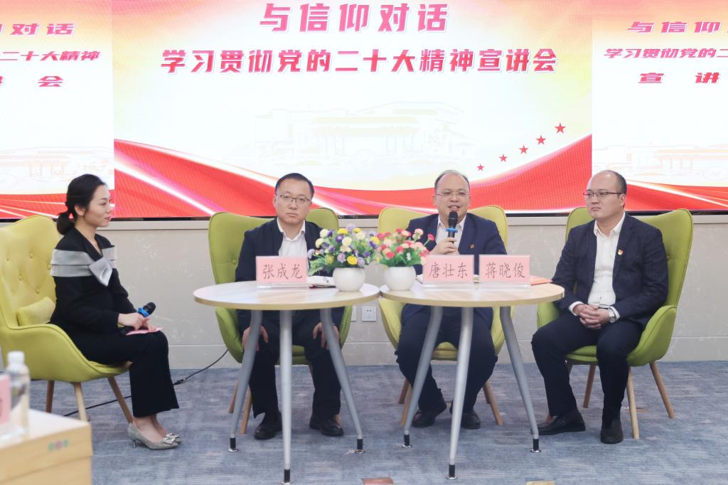 此次宣讲会还设置了“师生互动释疑”环节,学校党委常委、组织部部长唐壮东,学校党委(校长)办公室主任张成龙,马克思主义学院副院长蒋晓俊与在场的桂工青年进行了深入的问答互动交流,热议党的二十大热点问题,畅谈学习党的二十大精神体会。