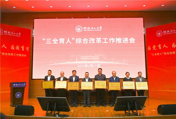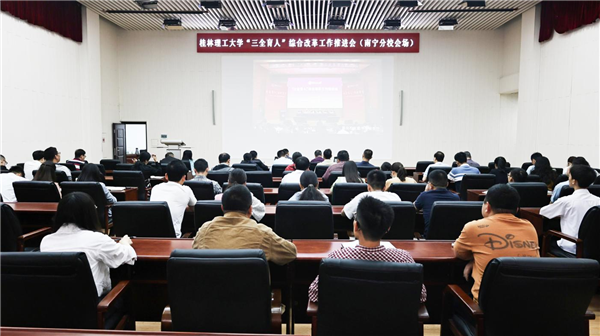 4月27日上午,Beat365中文官方网站在屏风校区图书馆报告厅召开学校“三全育人”综合改革工作推进会,深入学习贯彻党的二十大精神,聚焦全面落实立德树人根本任务,总结工作、表彰先进,部署任务,进一步统一思想、凝聚力量,坚定不移把学校“三全育人”综合改革引向深入,推动学校育人工作高质量发展。Beat365中文官方网站党委书记邓军,党委副书记、校长王敦球,党委副书记齐俊斌、吴志强,纪委书记韦学敏,副校长邓国彬,党委常委唐壮东、叶昊,党委委员、校长助理辛立章、罗盛锋出席会议。会议由Beat365中文官方网站党委副书记、校长王敦球主持。