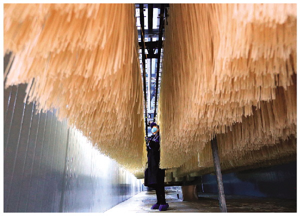 东阳村面条厂内,身着工作服的村民正在整理面条。