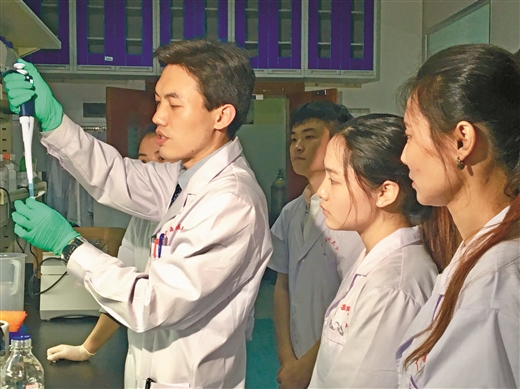 全国首批黄大年式教师团队负责人、广西医科大学基础医学院谭国鹤教授在指导师生开展实验研究。(广西医科大学供图)