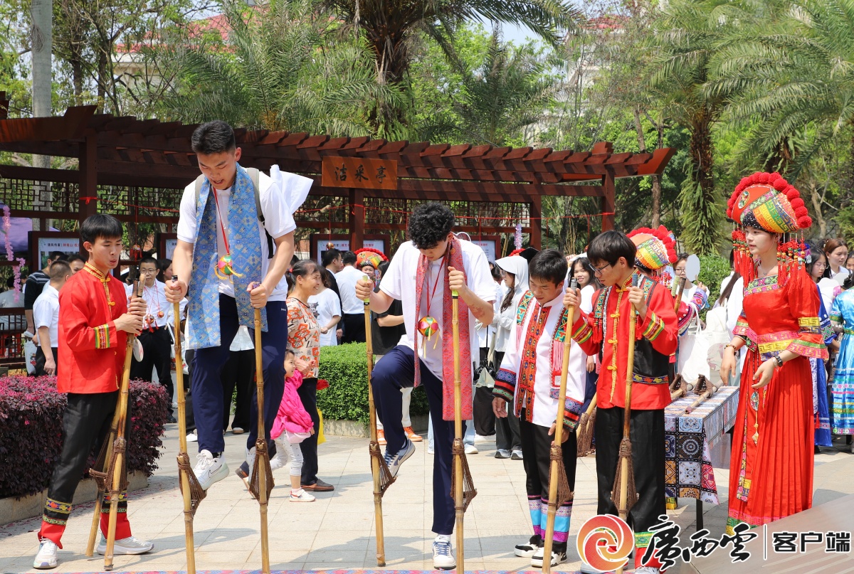 活动现场“桂味”十足。在校园特色文化园林广场——慧智园,身着民族服饰的桂工学子唱山歌,跳起绣球舞、竹竿舞、打榔舞,演奏壮族天琴,展示广西12个世居民族服饰,为观众带来了一场沉浸式民俗文化视听盛宴。各族师生共同体验踩高跷、打油茶、制漆扇、碰彩蛋、打陀螺、投壶等民俗趣味游戏,品尝民族特色美食,参与抛绣球、舞狮、珍珠球等民族体育项目,让民族文化以更贴近当代语境的形态浸润校园。