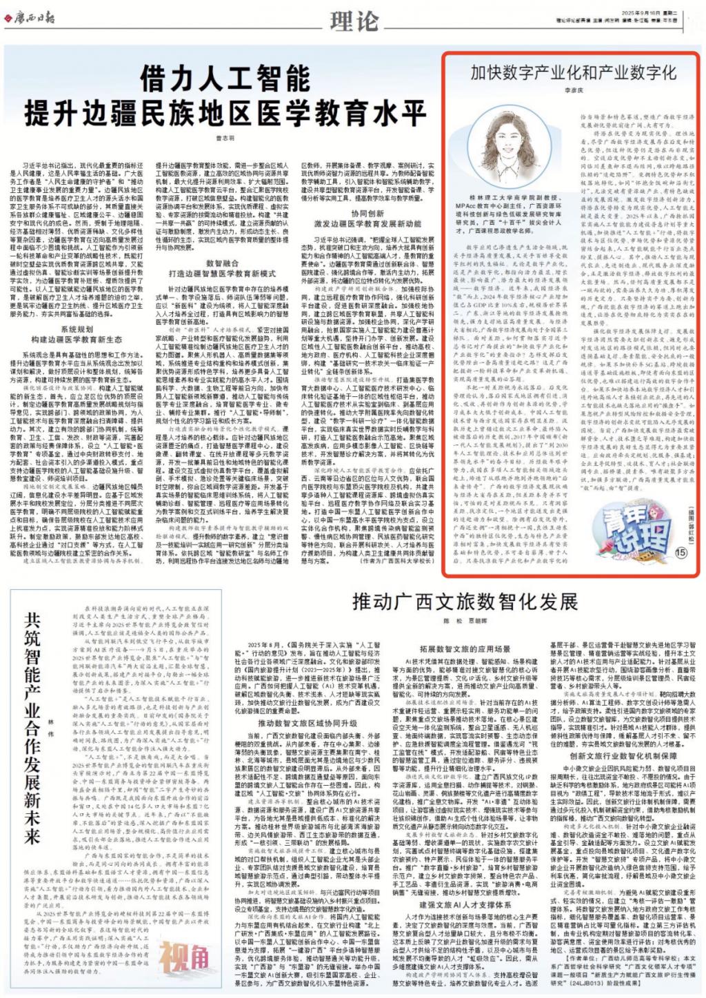 近日,《广西日报》“青年说理”栏目刊发Beat365官网商学院李彦庆副教授理论文章《加快数字产业化和产业数字化》。文章从“不把一时差距视为永远落后”“将潜在优势变为现实优势”“强化数字经济发展保障支撑”等三个方面作了介绍。现将全文转载如下。