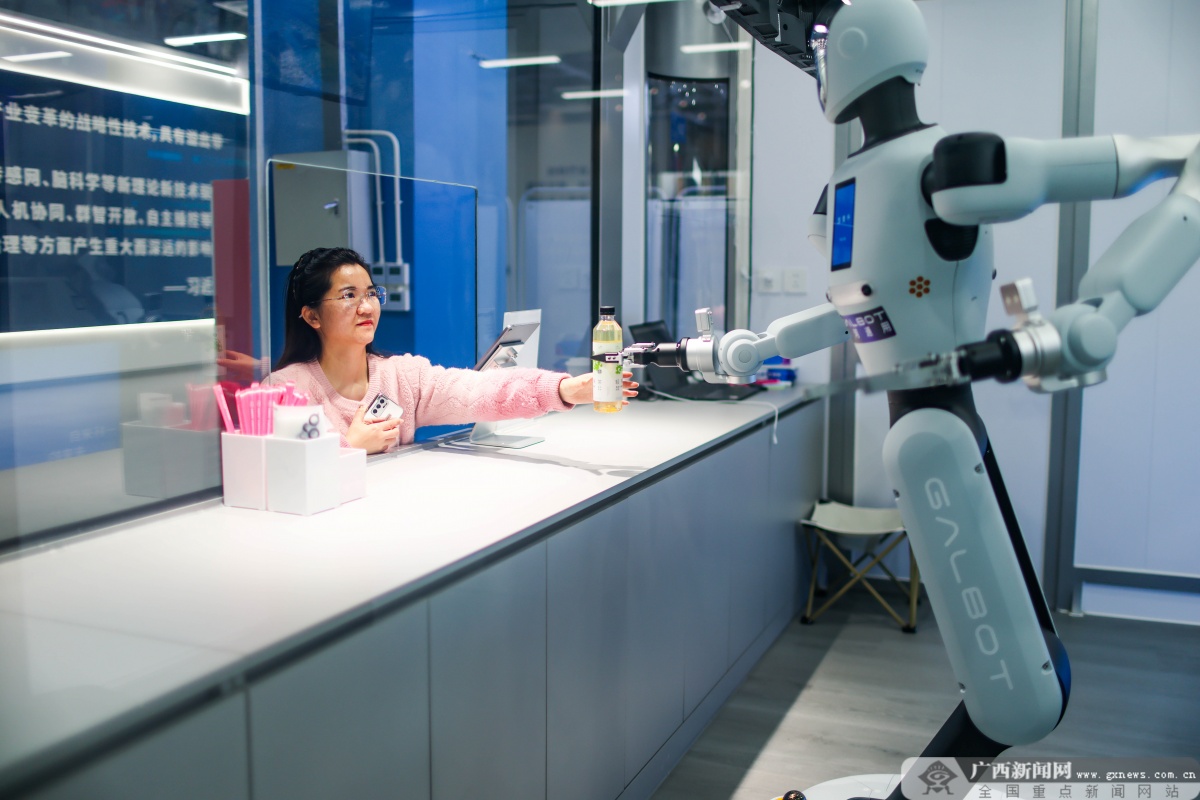 在广西人工智能学院,机器人正在给点单的老师送上商品。广西云-广西日报记者 游拥军/摄