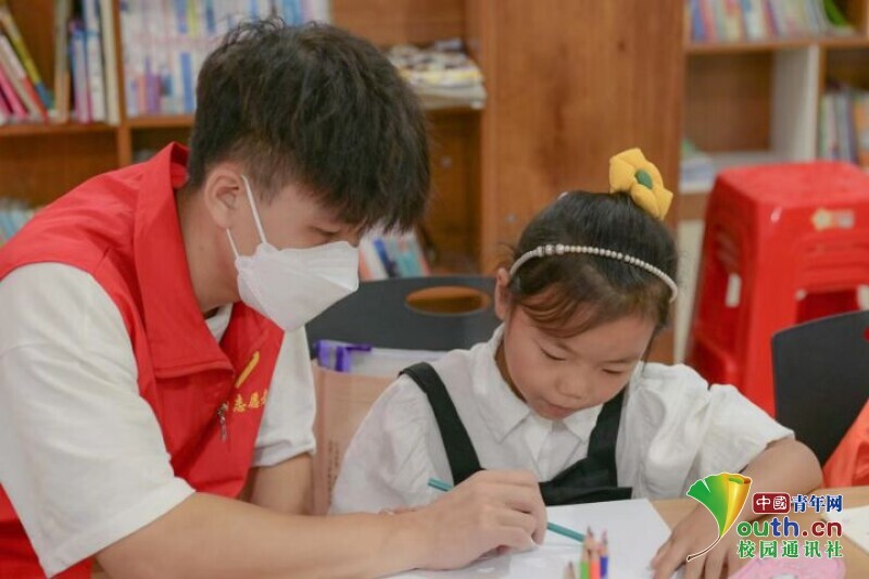 图为团队成员在辅导小朋友完成作业。中国青年网通讯员 梁洁 摄