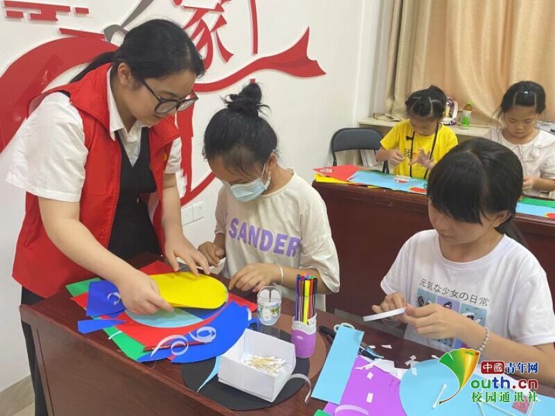 图为团队成员协助小朋友完成手工创作。中国青年网通讯员 何翊弘 摄