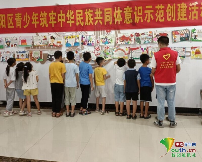 图为小朋友们观赏的优秀绘画作品。中国青年网通讯员 梁洁 摄