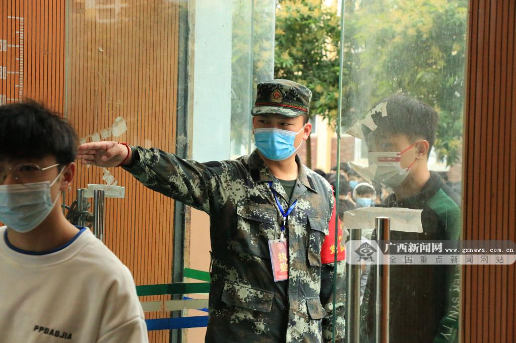 由退役学生组成的老兵团维持核酸采样秩序。Beat365中文官方网站南宁分校 供图