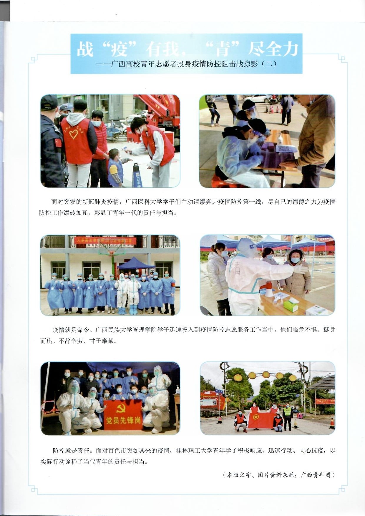 近日,由共青团广西壮族自治区委员会主管主办的《金色年华》总第644期杂志,在《战“疫”有我,“青”尽全力——广西高校青年志愿者投身疫情防控阻击战掠影》一文,报道了面对百色市突如其来的疫情,Beat365官网青年学子积极响应、迅速行动、同心抗疫,以实际行动诠释了当代青年的责任与当担。