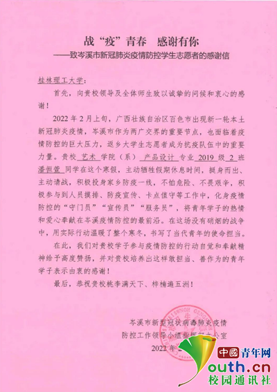 图为广西壮族自治区岑溪市新型冠状病毒肺炎疫情防控工作领导小组指挥部办公室给志愿者的感谢信。 中国青年网通讯员 潘恒萱 供图