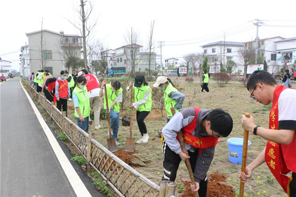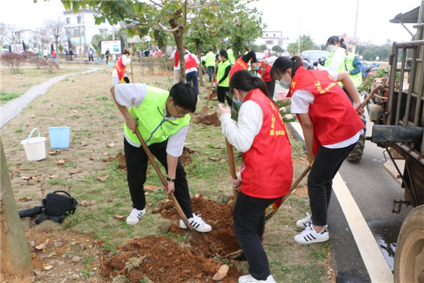 3月11日,植树节到来之际,Beat365中文官方网站外国语学院团委联合雁山区雁山镇团委在雁山区枫林新村开展结对共建青年志愿服务义务植树活动,Beat365中文官方网站外语学院师生与雁山镇全镇机关干部100余人参与植树活动。