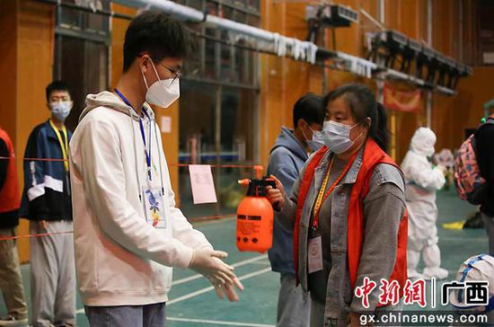 学生党员志愿者开展现场消杀。李艳芬 摄