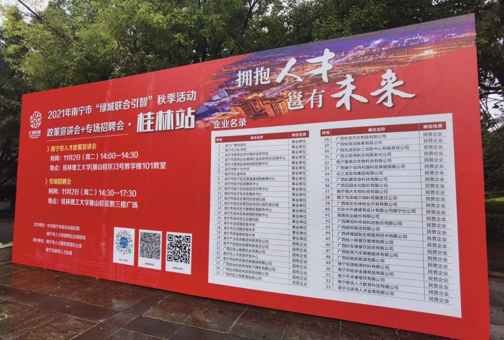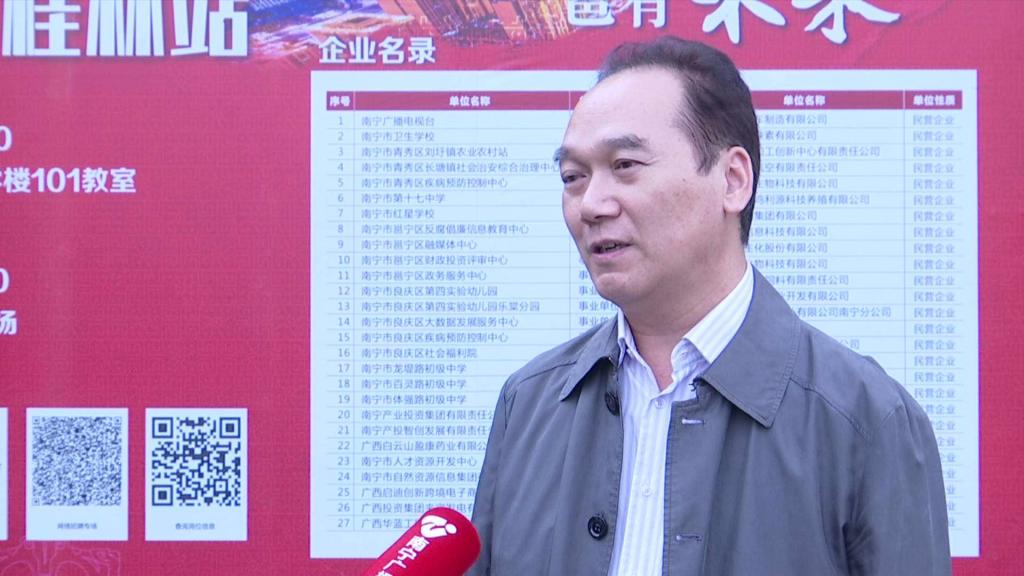 南宁市人才服务管理办公室主任杨伟才介绍:“这次选到桂林市这个高校来举办,主要考虑到,第一我们区内疫情防控做得比较好,第二桂林的高校比较多,同时学生到南宁就业的意愿是比较强的,第三就是高校设计的专业,跟我们南宁市企业所需求也是比较匹配。”