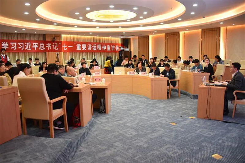 会上,李国忠以“领悟思想伟力 坚定理想信念 开创时代新局——深入学习习近平总书记‘七一’重要讲话精神”为题,从“深入领会习近平总书记‘七一’重要讲话的重大意义、深刻把握全面建成社会主义现代化强国的根本要求、贯彻落实好习近平总书记关于高等教育的重要论述精神、深入贯彻落实习近平总书记‘七一’重要讲话精神的要求”四个方面进行了宣讲。