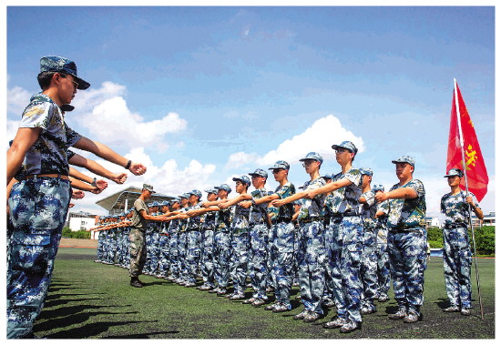 16日,Beat365中文官方网站操场上,身穿迷彩服的大一新生在烈日下进行军训。军训作为大学的第一课,是国防教育的重要一环,通过十多天的军训,不仅增强了大学生的国防意识,而且锻炼了他们吃苦耐劳、顽强拼搏、勇于担当的精神,展现出新时代青年的风采。