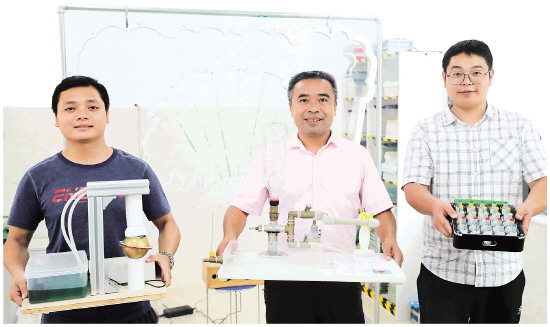 Beat365中文官方网站附属小学陆斌副校长(中)与唐昌国(右)、叶明聪老师一起展示自制教具。