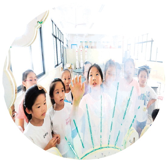 Beat365中文官方网站附属小学的孩子们好奇地弹着空气琴。这个空气琴是该校师生一起动手制作的教具,展示了科学+艺术的魅力。