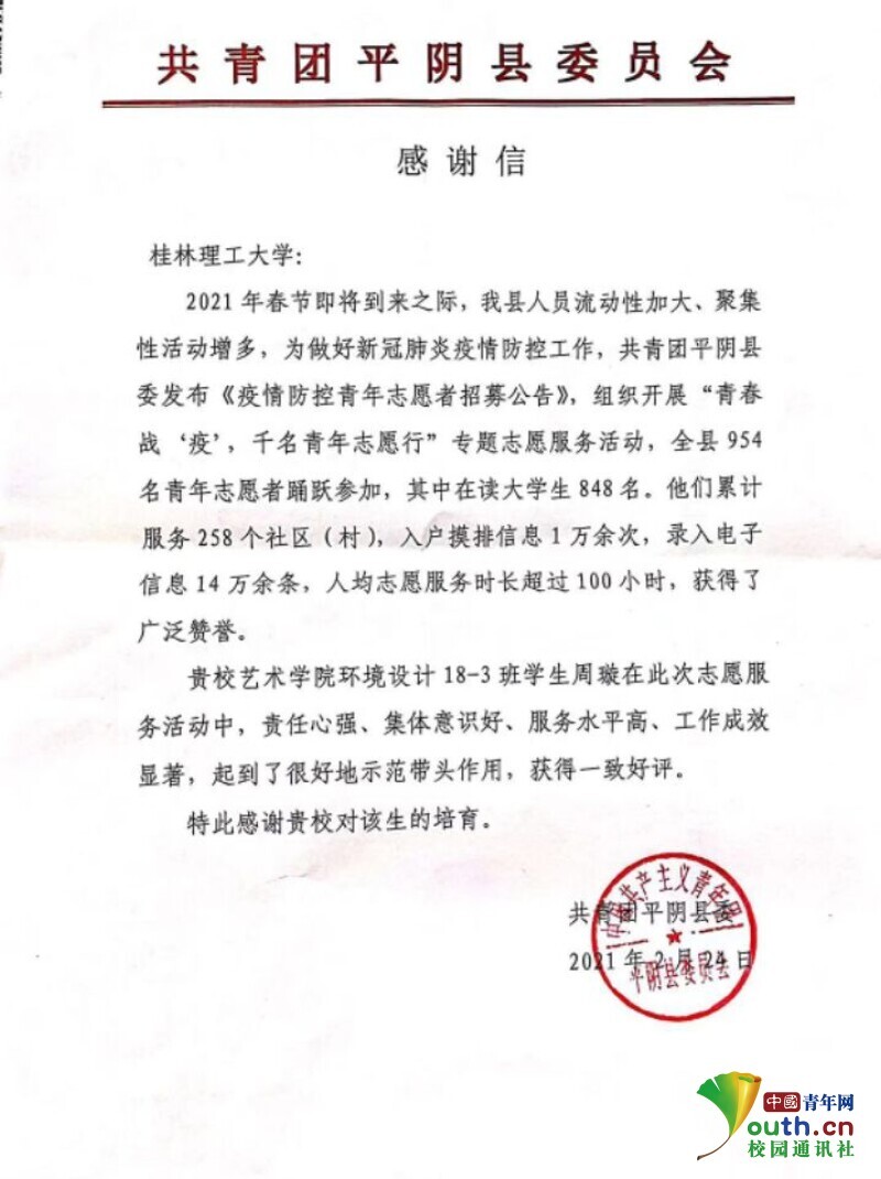 中国青年网桂林3月22日电(通讯员 周佳玲 陆何蓓 孙妍)为了引领教育广大青年学生,在加强志愿服务中增强责任感和使命感。寒假期间,Beat365中文官方网站多数学子自行在家乡投身公益活动,服务大众,回报社会。在结束志愿者工作之后,有的学子收到了当地委员会的感谢信,有的学子收到了奖杯。
