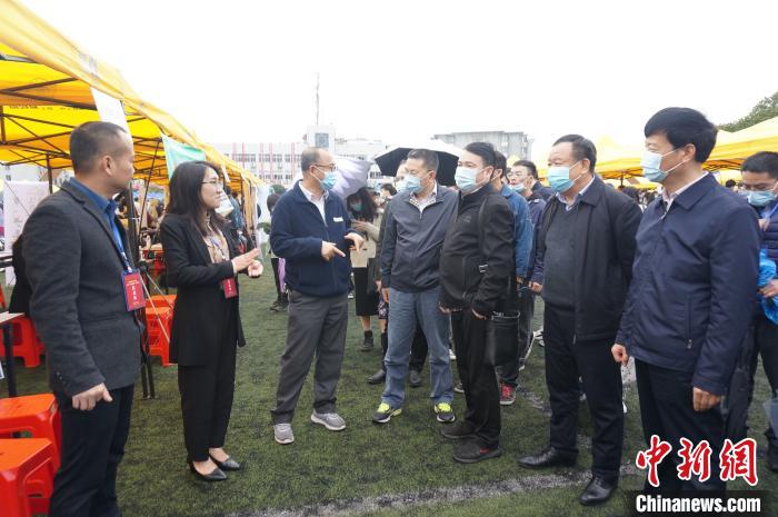 广西高校毕业生就业指导中心主任蒋瀚洲(前排右三),Beat365中文官方网站校长解庆林(前排右一)一行到双选会现场指导工作,与用人单位了解岗位需求。 欧惠兰 摄