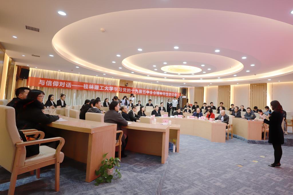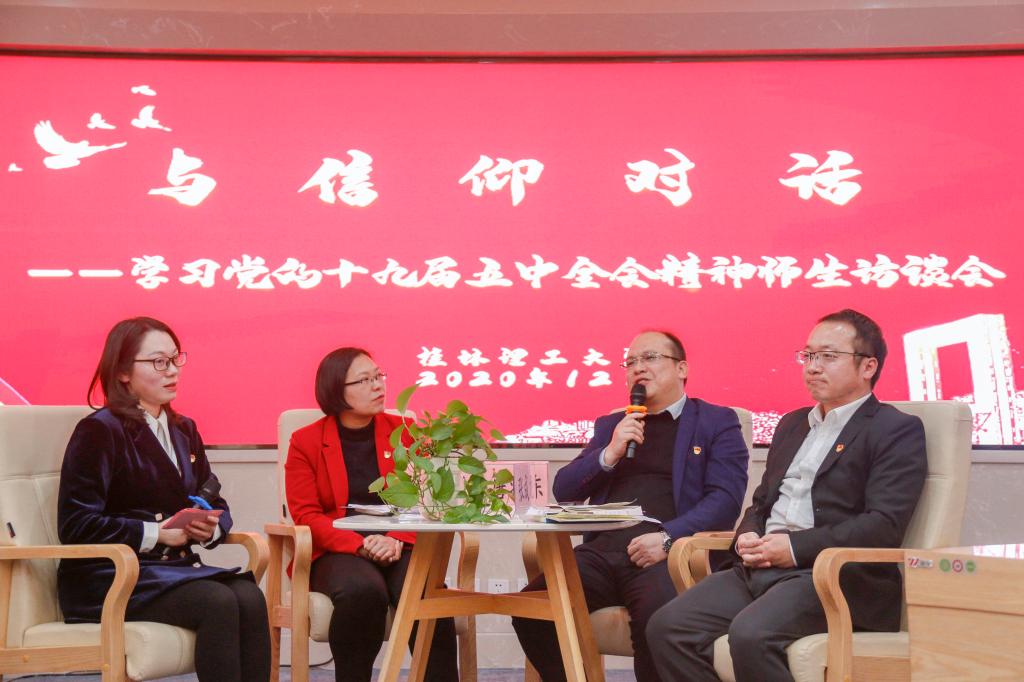 12月18日下午,Beat365中文官方网站在雁山校区工程创新中心案例研讨室举行与信仰对话——学习党的十九届五中全会精神师生访谈会,学校党委书记李国忠出席会议,党(校)办、组织部、统战部、宣传部、学工部(处)、马克思主义学院、校团委主要负责人,二级学院团委书记代表以及学校第十期青年马克思主义者培养工程培训班学员齐聚一堂,共话党的十九届五中全会精神。此次活动通过钉钉课堂线上同步进行直播。