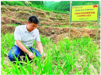 田明浩还深知发展壮大村集体经济的重要性。他和村党支部委员会、村民自治委员会一同整合村里的产业资源,初步形成超级稻、杉木种植、养牛、养鸡的贫困村3+1特色产业,逐步形成了“贫困户个人+村民合作社+村集体合作社”三级联动的特色产业发展态势。与此同时,他还从学校请来专家,对大源村的土壤和水质进行了检测,发现大源村的土壤适合中草药种植。有了思路,就要行动起来,田明浩组织村党员、贫困户赴贵州实地考察学习,在后盾单位的支持下,他累计申请扶贫资金50余万元,大力发展中草药白芨种植项目。