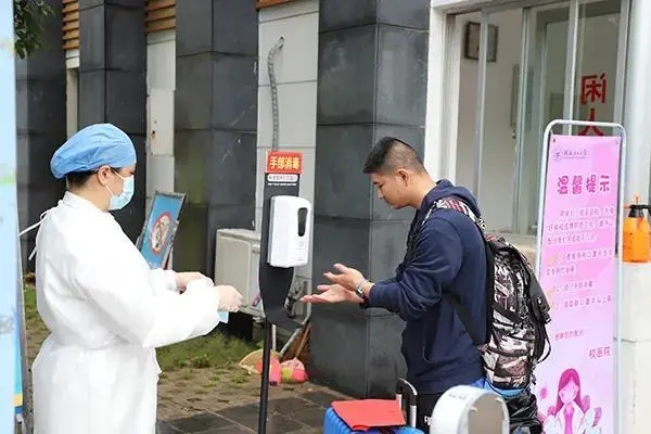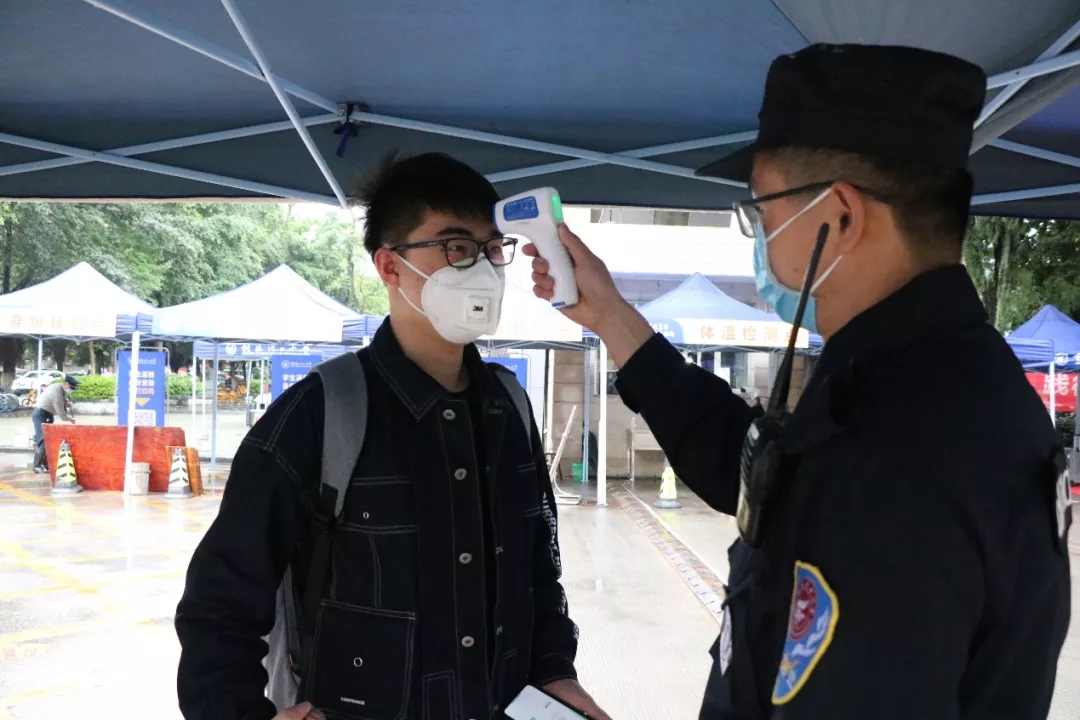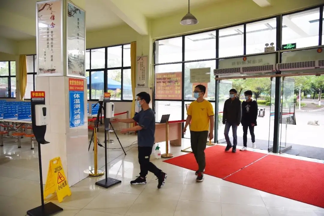 4月19日,Beat365中文官方网站毕业年级学生返校复学。入校五步骤依次是:钉钉扫码核验 → 体温检测 → 手部消毒 → 更换口罩 → 行李消毒。
