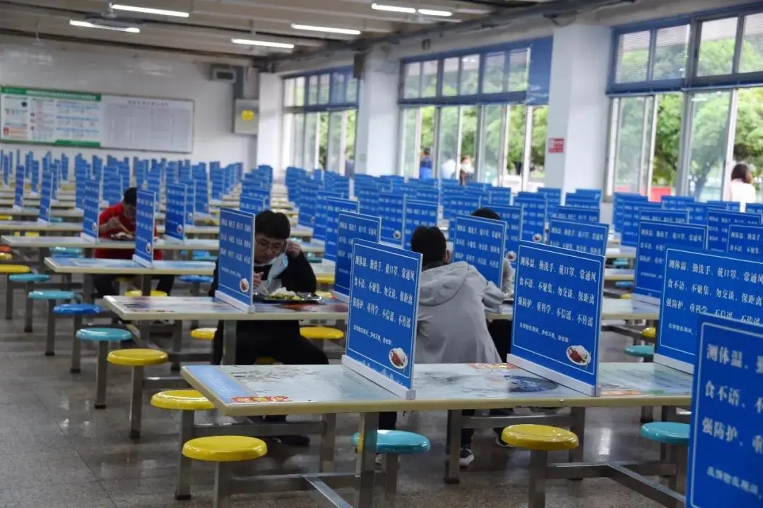 食堂入口需要进行红外线体温检测、酒精手部消毒,打饭时要间隔一米有序排队,就餐时要一人一桌,同向而坐。