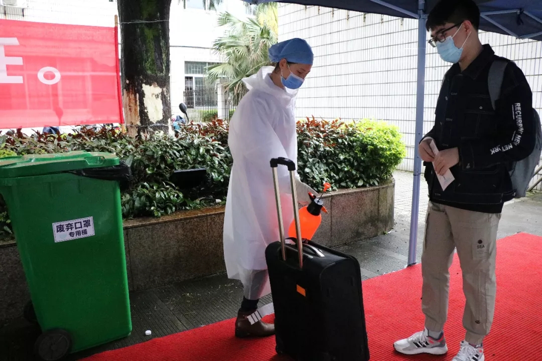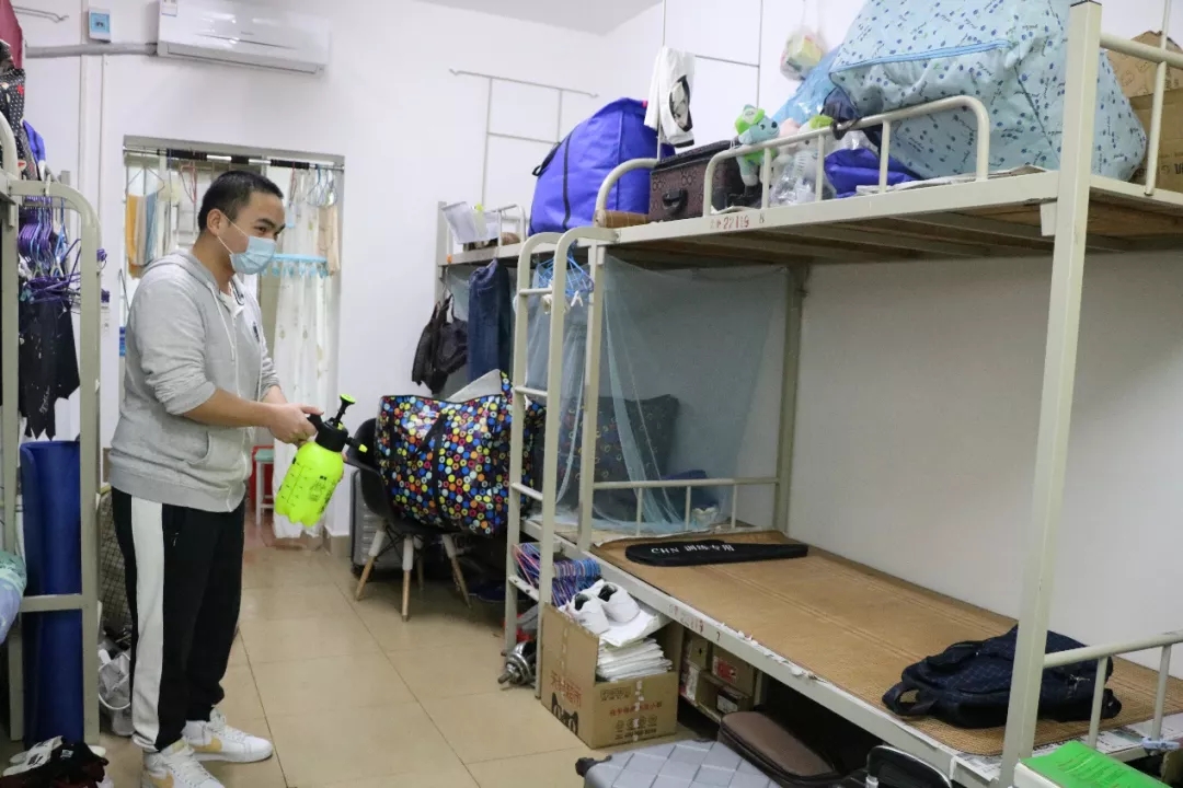 同学们回到久违的宿舍,对宿舍进行再次消毒,把准备好的个人防护用品拿出行李箱,开始新的宿舍生活。
