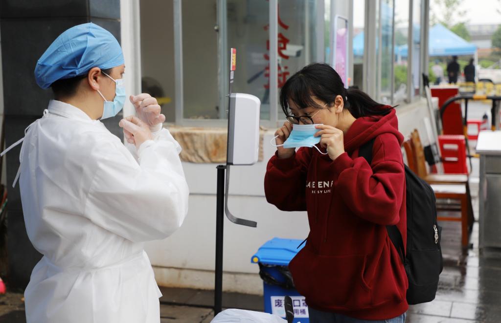 学校工作人员指导返校学生正确更换口罩