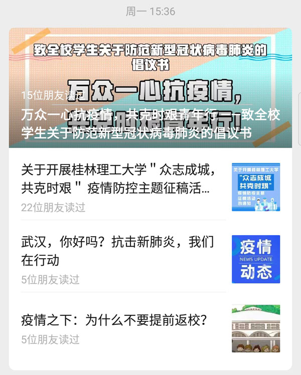 疫情发生以来,为充分做好广大青年学生的思想引领工作,党支部舆论宣传小组积极营造众志成城共同抗疫的舆论氛围,先后通过学工在线、易班、桂工青年等网络平台开展系列疫情防控宣传,发布最新的通知和要求,多渠道、多形式解读疫情防控知识。截至目前,累计推送相关推文120余篇,受到全校广大学生的积极关注和响应,总浏览量超15万余次。