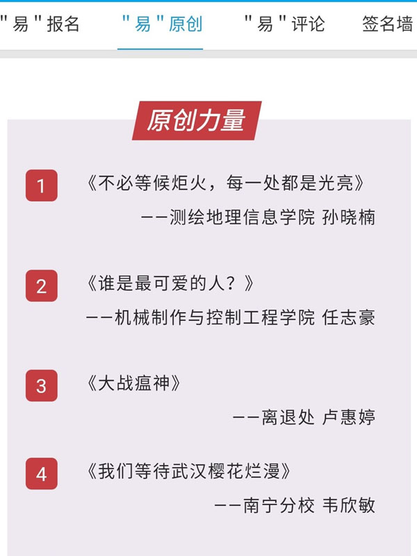 为增强广大青年学生对疫情防控知识的了解,凝聚打赢这场疫情防控阻击战汇聚青春力量,党支部线上教育小组组织开展丰富的线上学习活动,一是举办“科学防疫,从我做起”新型冠状病毒感染的肺炎专题线上知识竞赛活动,截至目前,参与人数达到12407人,累计发放第二课堂学分2512.4分,积极引导学生停课不停学,以宅家学习的方式提升自身防御力。二是开展“众志成城,共克时艰”疫情防控主题征稿活动,自2月3日征稿活动开展以来,已收到来稿60余篇,在线发布30篇来稿文章。内容分别涉及表达对疫区人民和一线人员的加油鼓励,表达对医护人员及社会各方援助力量无私无畏精神的赞扬和感激;记录身边疫情防控的点滴,展现细微而暖心的瞬间等。三是开展2020年春季学期开展“筑起防疫青春长城”线上主题团日活动,按照学校整体工作部署,结合疫情防控战进展,以团支部为单位,开展线上主题宣传教育活动;开展抗击疫情线上承诺活动;开展规划学习健康宅家交流分享活动等系列活动。