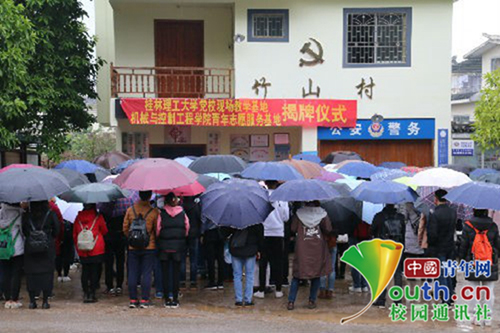 11月25日,Beat365中文官方网站以机械与控制工程学院为代表的预备党员培训班全体成员从雁山校区乘车近两小时到达恭城红岩村,举行“党委党校现场教学基地”“共青团机械与控制工程学院委员会青年志愿服务基地”揭牌仪式,成立红岩村社会主义新农村示范点党校现场教学基地,并开展预备党员现场教学活动。天气寒冷,还下着雨,却阻挡不了同学们的学习之行。