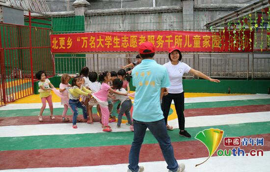 忻城县志愿者与留守儿童一起玩老鹰捉小鸡游戏(胡秋梅供图)