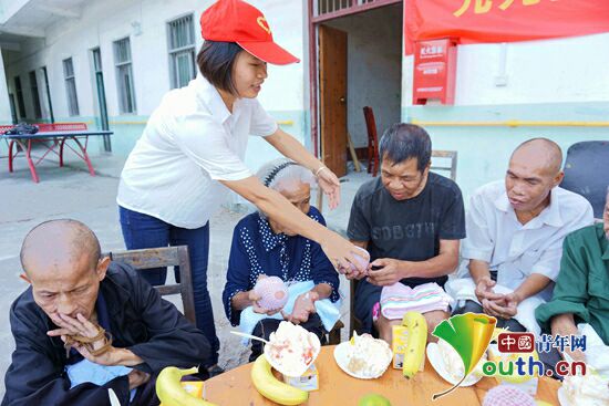 忻城县西部计划志愿者胡秋梅与敬老院老人一起过九九重阳节(胡秋梅供图)